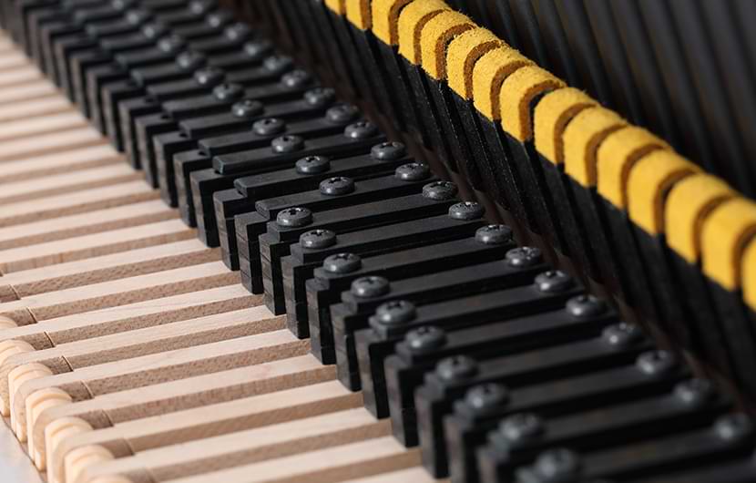 However, in order to reproduce every aspect of playing a grand piano, the NV12 retains the damper mechanism behind the keyboard action, with graded weights attached to each damper lever replicating the load of traditional wood and felt parts, as the keys and pedal are pressed.